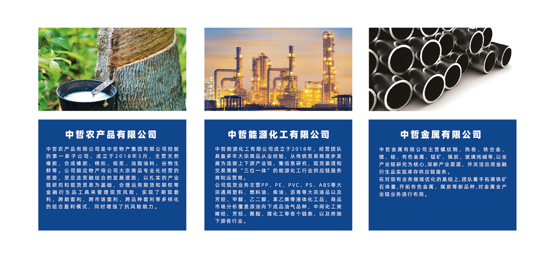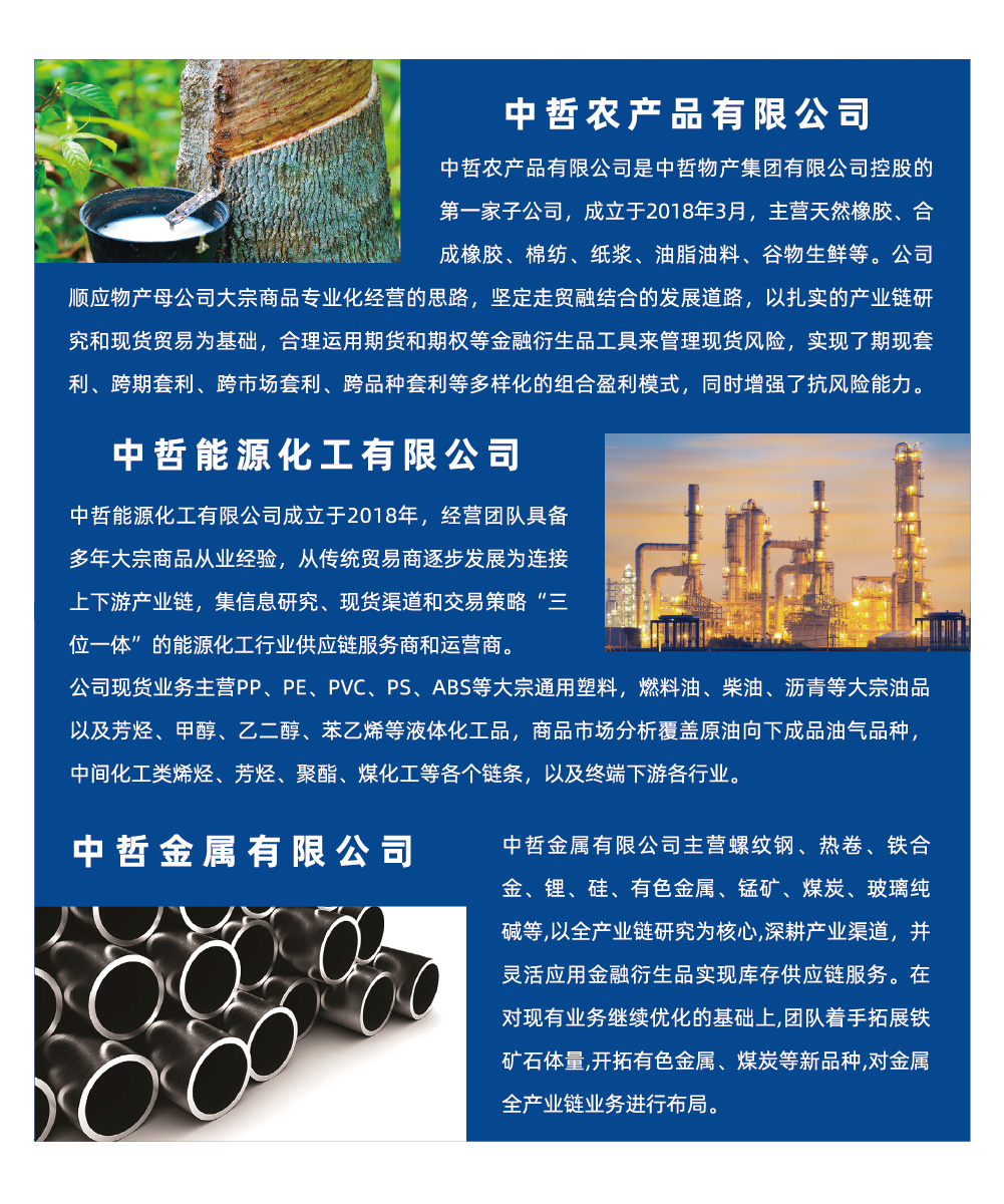 大宗商品事业部,以现货贸易为基础,产业链研究为核心,期货等金融衍生品为风险管理手段,旗下有农产品、能源化工、金属三大业务板块,总部位于浙江宁波,并在上海、青岛、越南等地设有办公地点。农产品主营天然橡胶、棉纺、油脂油料等;能源化工与上下游众多企业建立战略合作;金属主营黑色金属、有色金属、新能源材料等。